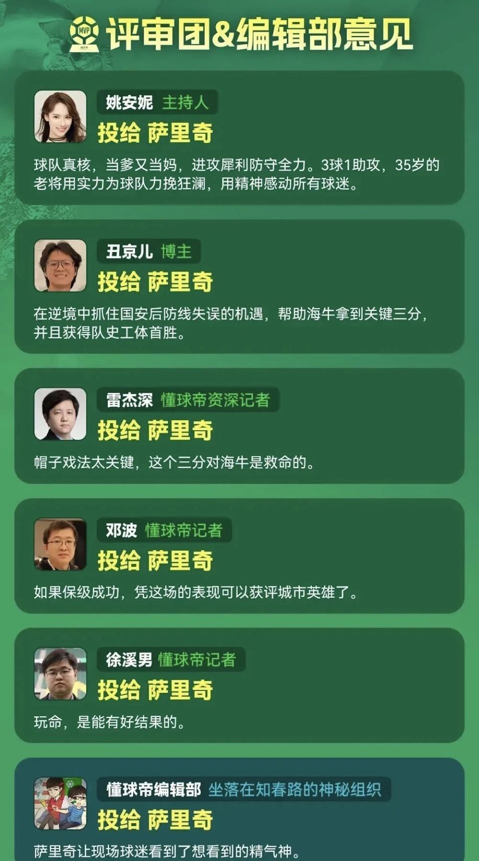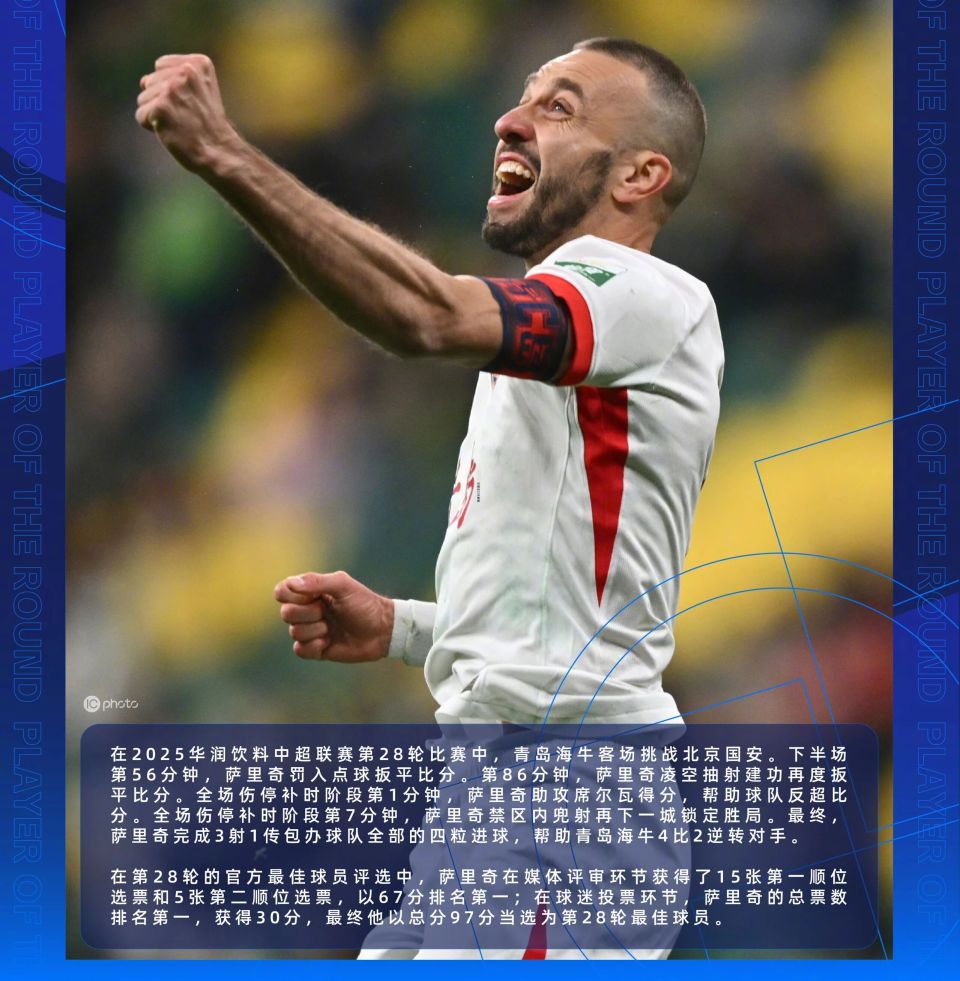 实至名归!昨晚,中超官方宣布青岛海牛的波黑前国脚萨里奇以不可撼动的绝对优势荣膺第28轮最佳球员。上周日晚上,萨里奇在北京工人体育场大放异彩,不仅上演“帽子戏法”,还助攻阿森纳旧将韦林顿进球,帮助客场作战的海牛4:2逆转战胜北京国安,在实现历史性突破的同时拿到保级路上价值连城的3分。根据中超官方发布的信息,萨里奇在媒体评审环节获得了15张第一顺位选票和5张第二顺位选票,以67分排名第一;在球迷投票环节,萨里奇的总票数排名第一,获得30分,最终他以总分97分当选中超第28轮最佳球员。97分是个什么概念?这么说吧,中超官方第24轮至27轮的最佳球员殊荣分别归属卡扎伊什维利、莱昂纳多、法比奥和罗慕洛,其总分仅分别为87分、91分、80分和72分。而8月31日,山东泰山的格鲁吉亚“神锋”卡扎伊什维利完成“大四喜”壮举并送出一次助攻,帮助泰山主场6:0横扫国安,凭此以总分99分当选中超官方第23轮最佳球员。▲在海牛客场4:2逆转战胜国安的比赛中,萨里奇仅射门4次就斩获3球,传球成功率为73.1%。