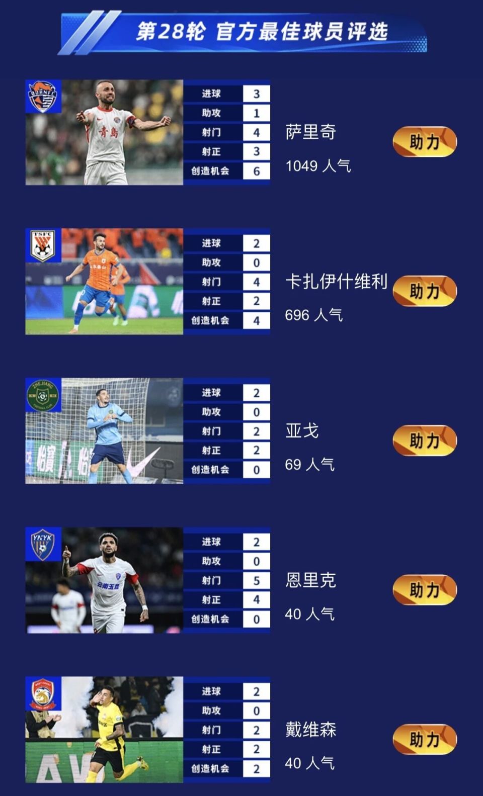 ▲青岛西海岸的巴西外援戴维森亦候选中超官方第28轮最佳球员。上周日晚上,在西海岸主场2:2战平争冠球队成都蓉城的比赛中,戴维森梅开二度。本赛季至今,34岁的戴维森在中超出场27次,其中26次首发,总共攻入8球并送出3次助攻。